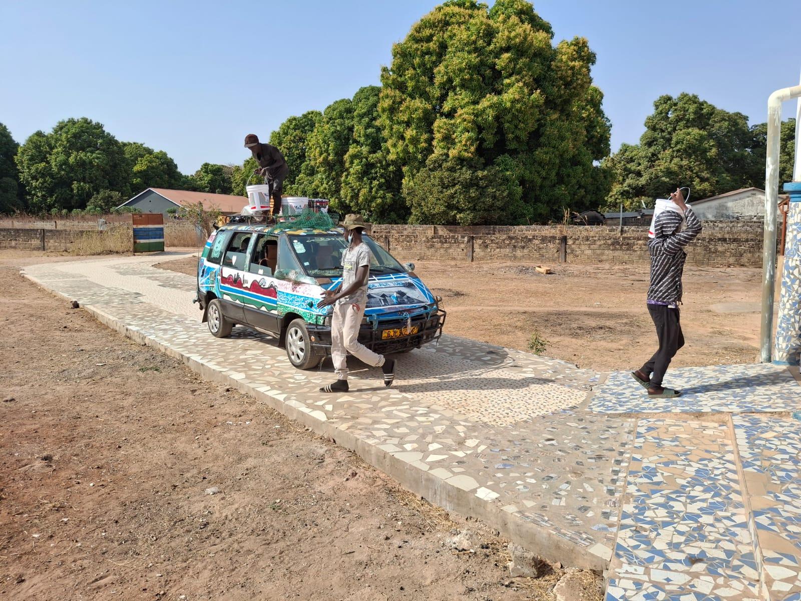 Gestern, nachdem wir am Freitag im Malergeschäft alles bestellt und zum Teil mitgenommen hatten, wollten wir mit den Handwerkern der Malerfirma nur noch ca 12 Farbeimer der bestellten Qualität abholen und alles nach Suwareh Kunda bringen. Man wollte uns jedoch reinlegen und eine schlechtere Qualität zum ausgehandelten Preis andrehen, was dem Maler aufgefallen ist, und dann ging der “ Trabbel“ richtig los. Am Ende hatten wir unsere bestellte Farbe und sind mit einer kaum noch funktionierenden Fähre gegen 16.00 Uhr in Barra angekommen. Die bestellte Großraumtaxe war kurz vorher zur Werkstatt wegen Probleme am Motor und wir waren gegen 18.30 Uhr in Suwareh Kunda mit Material und Handwerkern, die heute ihre Arbeit beginnen.