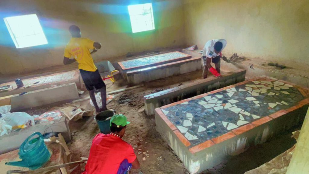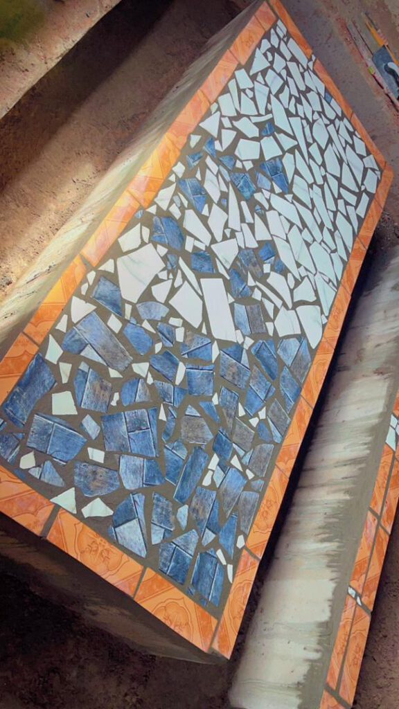 Wir konnten wieder eine gute Summe Spendengelder an die Lower Basic School in SMD überweisen. Sodass der Ausbau des Essenraumes für die Kinder fortgesetzt werden konnte: Die Tische und die Sitzbänke werden momentan gekachelt. Denn wir bauen feste Tische und Bänke, weil sie langlebiger sind. Wie man an den Fotos sieht, haben wir den Bauauftrag wieder an lokale Handwerker vergeben. Und sie haben die Spenden sparsam verwendet, indem sie Kachelbruch statt Kacheln gekauft haben. Nicht nur kann man so mehr Tische und Bänke fertigstellen, es sieht auch noch schön lebendig aus.