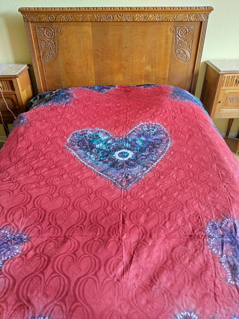 Unser Verein hat diese Workshops sehr gerne unterstützt, auch mit dem Ankauf der schönen Stoffe. Jetzt erreichte uns ein erstes Foto aus Berlin, das eines der großen Tücher als Betttuch präsentiert. Es musste erst noch umgenäht werden, aber jetzt ziert es farblich perfekt passend das Schlafzimmer: